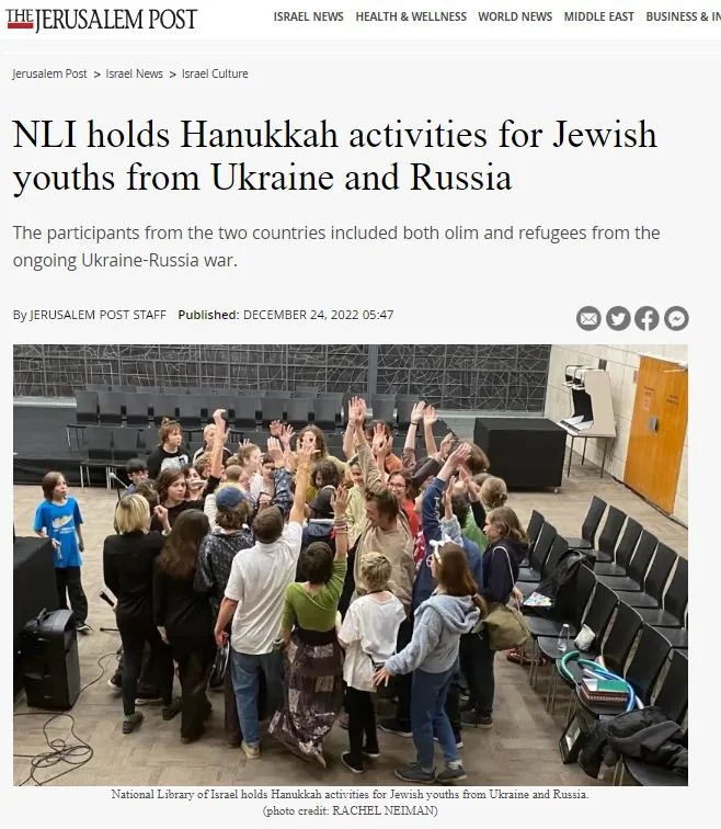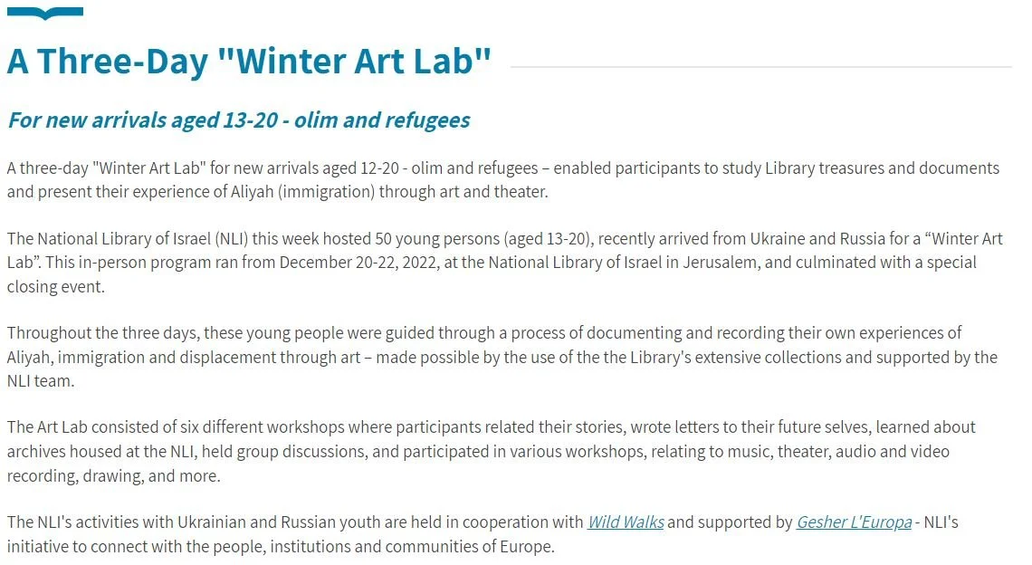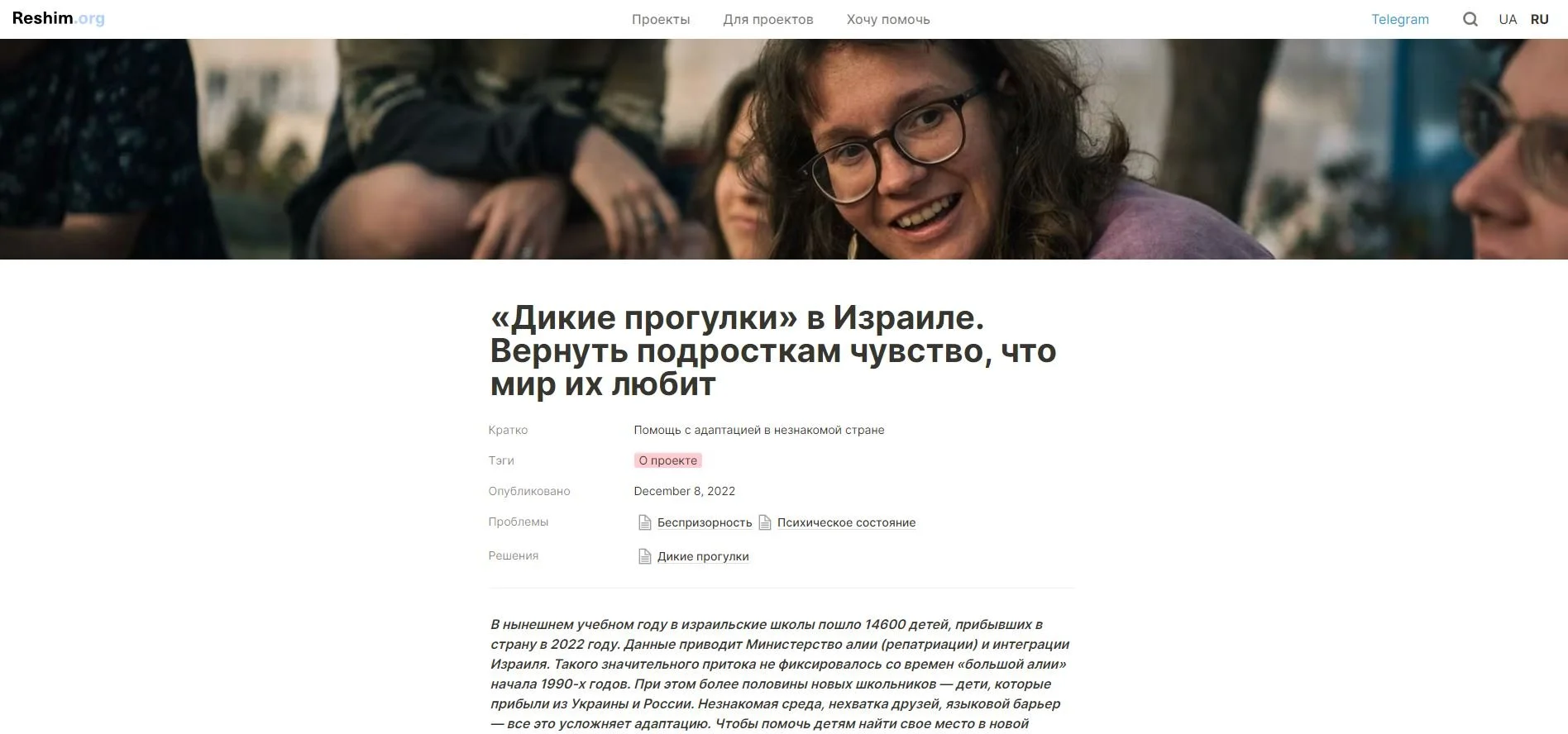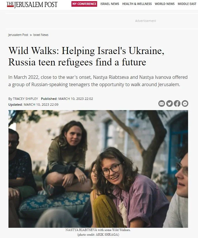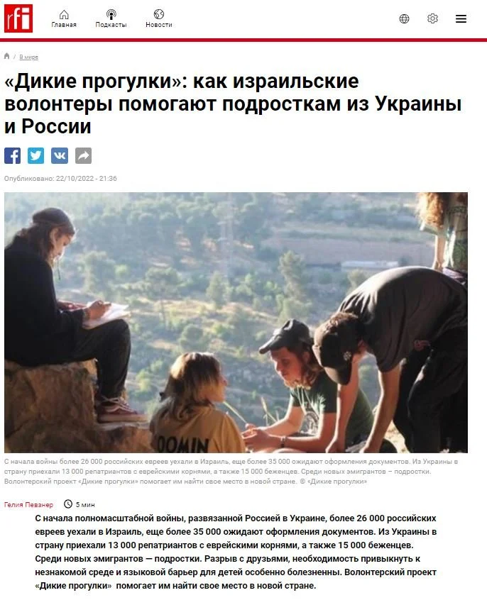 Пресса о “Диких прогулках” Карточки о проекте “Дикие прогулки” в “Службе поддержки”Приложение Helpdesk Media Разговор о проекте с Настей Рябцевой на радио РекаРадио Река О проекте “Дикие прогулки” на сайте БФ “Настоящая Россия”Настоящая Россия Wild Walks: Helping Israel's Ukraine, Russia teen refugees find a futureJerusalem Post Israel is Inclusive and GlobalIsrael Active «Дикие прогулки» в Израиле. Вернуть подросткам чувство, что мир их любитReshim.org «Дикие прогулки»: как израильские волонтеры помогают подросткам из Украины и РоссииФранцузская радиостанция RFI NLI holds Hanukkah activities for Jewish youths from Ukraine and RussiaJerusalem Post Chanukah youth activity for new arrivals from Ukraine and RussiaJ-Wire A Three-Day "Winter Art Lab"The National Library of Israel מהמלחמה באוקראינה לספרייה הלאומית באישראלישראל היום Монеточка о встрече с “Дикими прогулками”@monetochkaliska Татьяна Лазарева о встрече с “Дикими прогулками”@lazarevatut